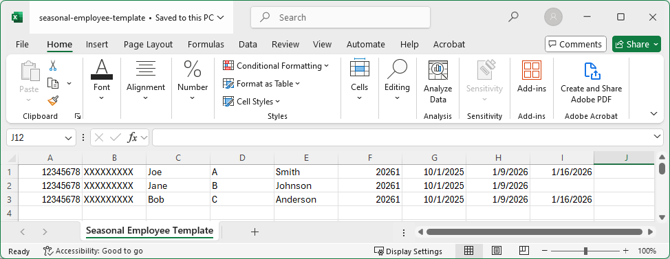 You will submit your seasonal employee list using a file upload, which allows you to provide all your employee data in a single file. Seasonal employee lists must be received on or before the last day of the month following the end of the calendar quarter.
